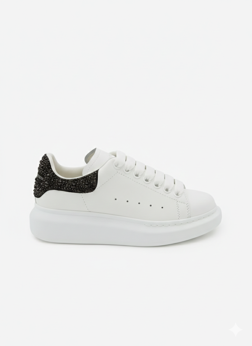 Zona călcâiului este accentuată de inserții Jet Black cu cristale strălucitoare, care oferă un contrast elegant și o notă distinctivă de rafinament ✨. Talpa groasă oferă confort excepțional și stabilitate, iar interiorul moale asigură o senzație plăcută la purtare.