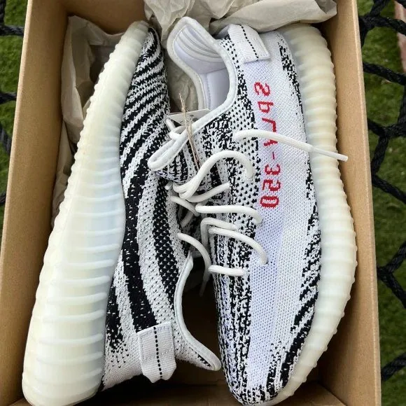 Adidas Yeezy Boost 350 V2 Zebra este un model emblematic, ce combină un design clasic cu un contrast puternic de alb și negru, completat cu accente roșii.